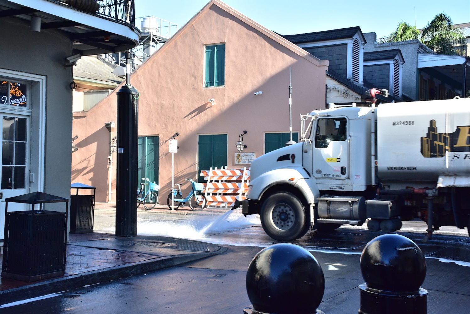 とくに雨が降っていないのに濡れた地面の反射でいい感じなのを不思議に思っていたら、水を撒き散らしながら道路を清掃する車が走っているためだった。